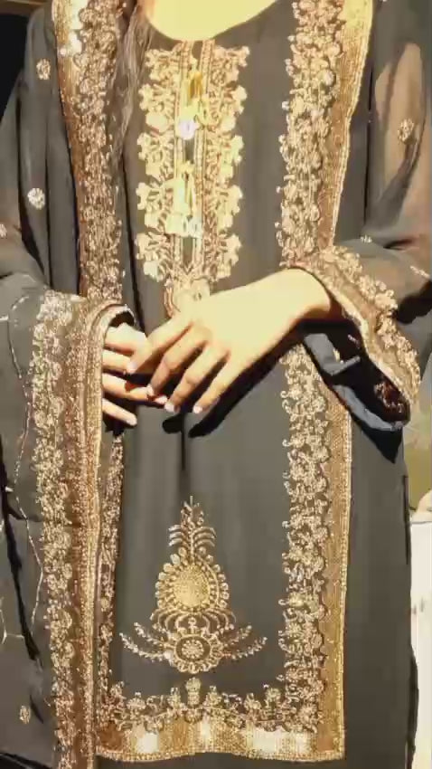 Elevate your style with this beautifully crafted 3-piece stitched suit made from premium pure chiffon. The outfit is adorned with delicate zari embroidery and press nug embellishments, creating a graceful and luxurious look. Designed for elegance and comfort, this suit is perfect for festive gatherings, evening wear, and special occasions.
